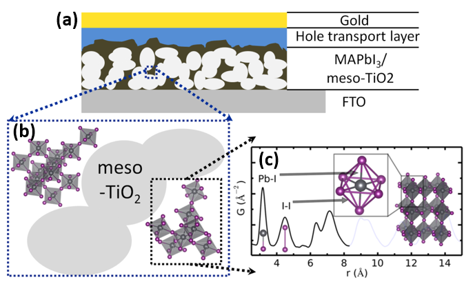 For solar electricity to be economically competitive with fossil fuel based electricity, the cost of fabricating and installing solar cells needs to be much lower. Solution processed solar cells can potentially achieve this with a drastically lower fabrication cost but their low performance has so far limited their success. Recently, solar cells based on methylammonium lead iodide (MAPbI3) perovskites have burst on to the stage looking set to revolutionize the field of solution processed solar cells – only after 4 years since the first solar cell report in 2009, greater than 15% power conversion efficiency has been achieved. A full understanding of these devices requires an atomic level understanding of the optically active material. However, this is a major challenge because the active metal-organic perovskite is nanostructured and integrated into a mesoporous network of titania where the majority of the material present is the matrix oxide. It is notoriously difficult to determine the structure of nanomaterials in general, which are not amenable to crystallographic methods, but even more so when they are minority phases in a heterogeneous complex as in this case. In this collaborative work between Billinge and Owen research groups at Columbia University, the first fully quantitative structural characterization of mesoporous titania supported MAPbI3 using atomic pair distribution function (PDF) analysis of high energy X-ray diffraction data is reported. Strikingly, in contrastto conventional wisdom that high efficiency solar cell materials are typically highly crystalline, the PDF analysis reveals a two component nanostructure: one component with medium range crystalline order (30 atomic %) and another with only local structural coherence (70 atomic %). The nanostructuring correlates with a blue-shift of the absorption onset and increases the photoluminescence. These findings suggest that disordered and amorphous phases, which are not visible in conventional XRD measurements, are likely important to solar cell device efficiency, a factor that will depend on the processing method. They underscore the importance of fully characterizing and controlling the crystallinity in these devices. The manuscript was published in the November 22, 2013, online edition of the Nano Letters (http://pubs.acs.org/doi/abs/10.1021/nl403514x).