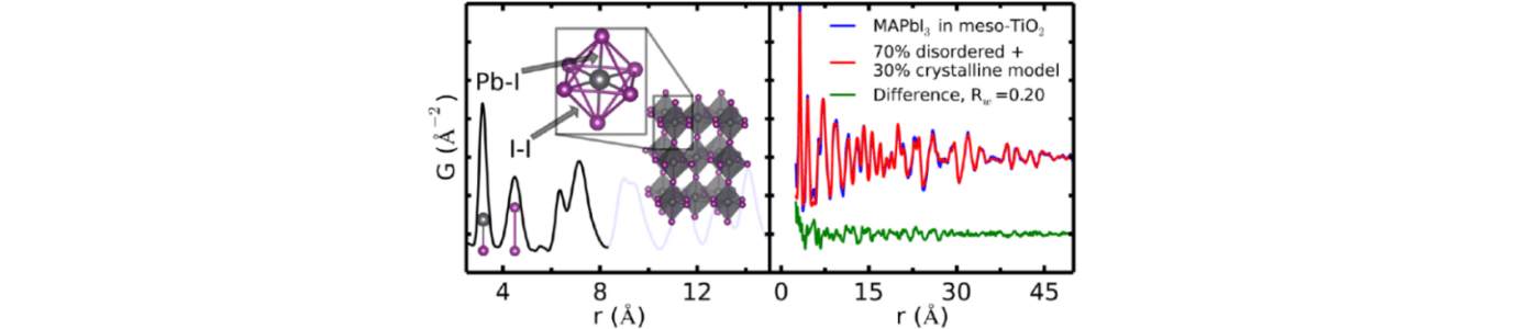 There has been a strikingly rapid increase in the performance of solar cells based on methylammonium lead iodide (MAPbI3) perovskites following the first report in 2009; today greater than 15% power conversion efficiency has been achieved. A full understanding of these devices requires an atomic level understanding of the optically active material. However, this is a major challenge because the active metal-organic perovskite is nanostructured and integrated into a mesoporous network of titania where the majority of the material present is the matrix oxide. It is notoriously difficult to determine the structure of nanomaterials in general, which are not amenable to crystallographic methods, but even more so when they are minority phases in a heterogeneous complex as in this case. Here we report the first fully quantitative structural characterization of mesoporous titania supported MAPbI3 using atomic pair distribution function (PDF) analysis of high energy X-ray diffraction data. Our pair distribution function analysis reveals a two component nanostructure: one component with medium range crystalline order (30 atomic %) and another with only local structural coherence (70 atomic %). The nanostructuring correlates with a blue-shift of the absorption onset and increases the photoluminescence. Our findings suggest that disordered and amorphous phases, which are not visible in conventional XRD measurements, are likely important to solar cell device efficiency, a factor that will depend on the processing method. They underscore the importance of fully characterizing and controlling the crystallinity in these devices.